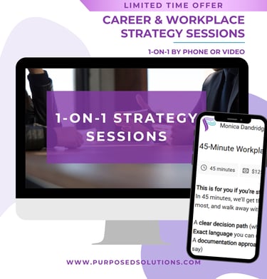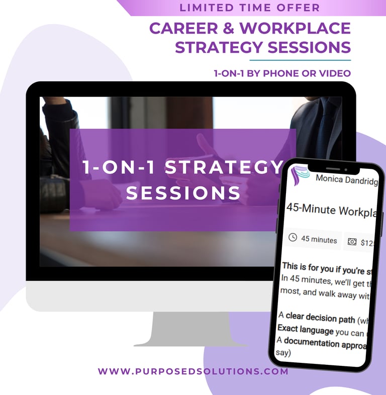 This 1:1 Workplace Strategy Session is educational, not legal advice and is designed to help you understand your workplace options, organize your next steps, and communicate with confidence.