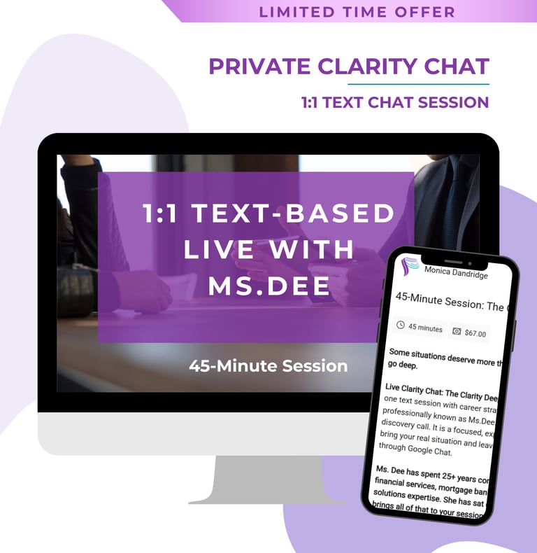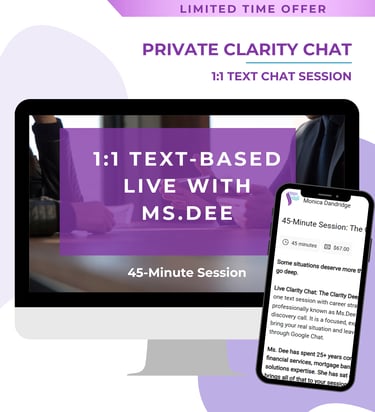 The Private Clarity Chat is a 45-minute, 1:1 real-time text session conducted through Google Chat. It is designed for professionals who need workplace strategy, communication support, and practical next-step guidance in a format that is private, focused, and easy to follow.