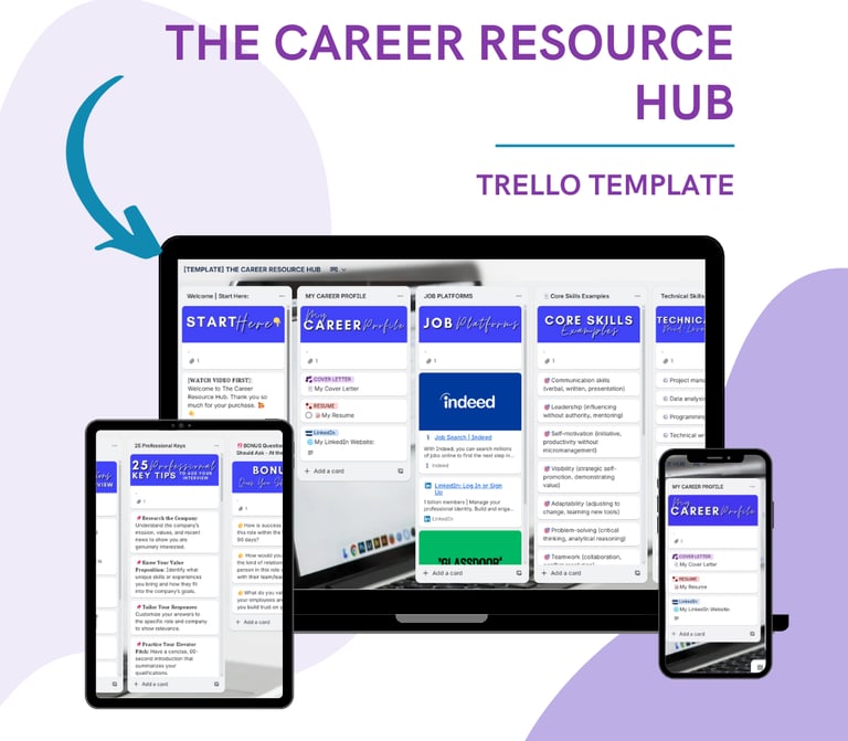Support is available through a 45-minute Strategy Session (flagship) and self-serve tools, including Trello systems, documentation kits, and a Career Resource Hub—built to save time, remove guesswork, and help you take action without overwhelm.