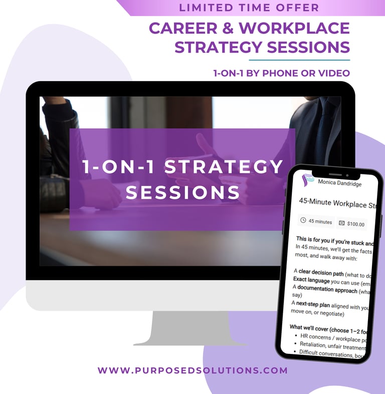 This 1:1 Workplace Strategy Session is educational, not legal advice and is designed to help you understand your workplace options, organize your next steps, and communicate with confidence.